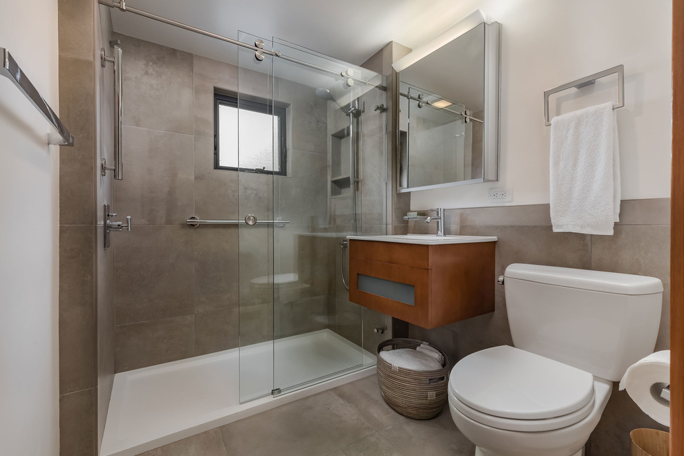 Small Modern Bathroom With Floating Vanity And Alcove Shower